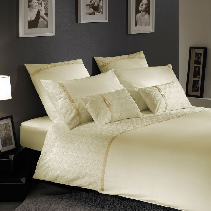 Percale rebrodée avec motif placé, ruban gros grain brillant caramel.
