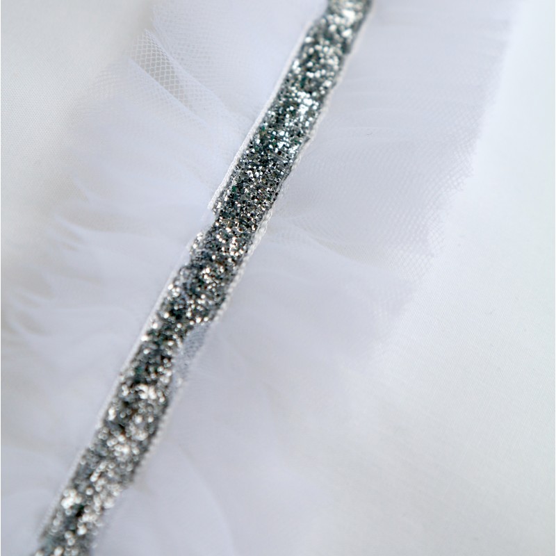 Tulle froncé parcouru par un ruban lurex brillant aux reflets scintillants.