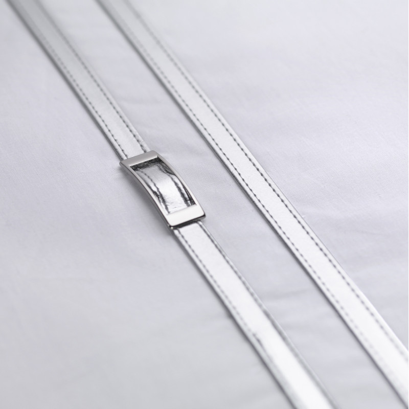 Percale blanche pur coton 80 fils/cm2 parée d'une ceinture fine argentée double rang enserrant une boucle en métal argenté.